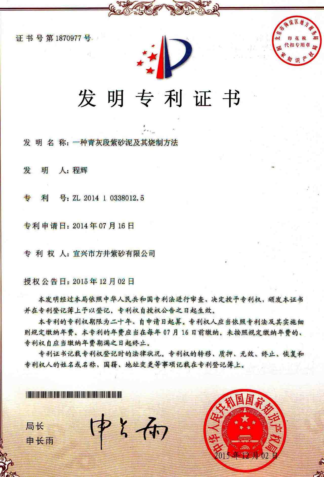 国家标准《紫砂陶器》(GB/T 10816 1989) 起草人 《宜兴紫砂泥料标准》制定专家组 组长